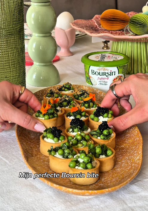 Maak de feestelijke tartelettes met Boursin Cuisine van Kirkookt: frisse doperwten, kruiden en romige Boursin. Perfect voor Pasen, brunch of borrel.